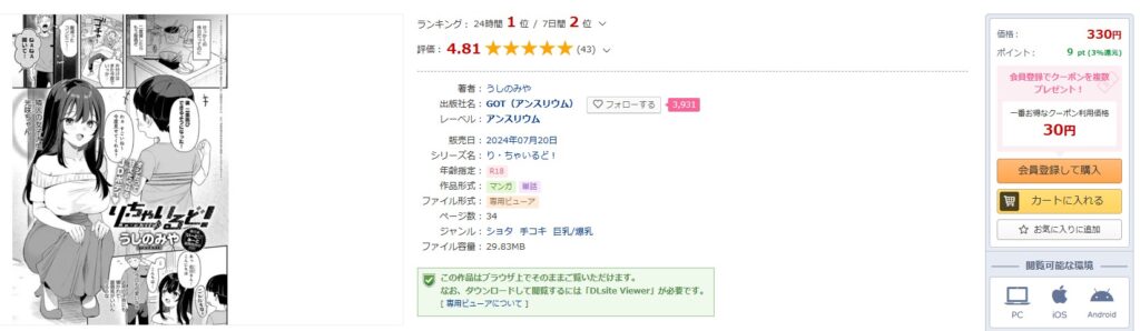 「り・ちゃいるど!」はDLサイトが最安値で配信中、初回登録クーポンを利用すると30円で全ページ読むことができます!